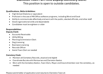 CLARKSTON TOWN JOB OPENING NOTICE No. 23-01 Date Posted: November 28, 2023 Closing Date: Until Filled … Read More