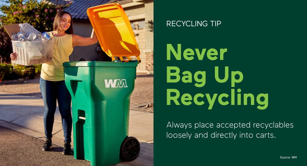 Help keep the recycling stream clean by only placing accepted materials into recycling carts. Only recycle clean cardboard, paper, and metal and plastic containers. Also, be sure to place recyclables directly into your curbside carts. Never bag up recyclables!